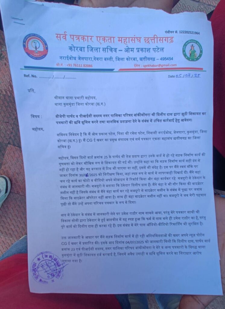 छत्तीसगढ़/कोरबा नगर पालिका परिषद बांकीमोंगरा के भाजपा पार्षद व पीआईसी सदस्य दिलीप दास द्वारा पत्रकारों पर झूठा आरोप लगाने और मानसिक प्रताड़ना देने का मामला गरमा गया है । पत्रकारों ने कुसमुंडा थाना पहुंचकर उनके खिलाफ कानूनी कार्रवाई की मांग को लेकर लिखित शिकायत कराई है ।