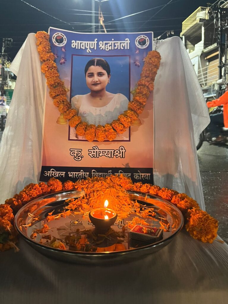 आज छत्तीसगढ़ कोरबा जिले के दीपका स्थित बजरंग चौक में अखिल भारतीय विद्यार्थी परिषद् के कार्यकर्ताओं एवं स्थानीय जनों द्वारा सौम्याश्री को अश्रुपूरित श्रद्धांजलि अर्पित की गई । श्रद्धांजलि सभा में मौन धारण कर एवं दीप प्रज्वलित कर सभी ने उनकी आत्मा की शांति के लिए प्रार्थना की ।
