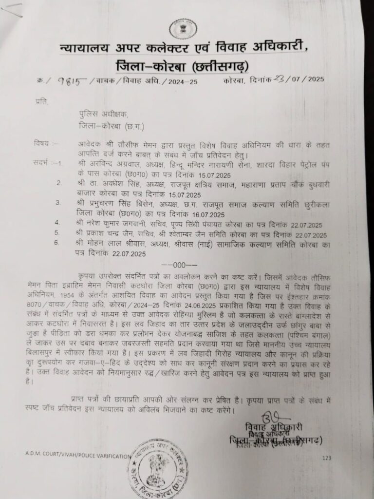छत्तीसगढ़/कोरबा जिले में विगत तीन महिनों से चर्चा का विषय बना कुमारी शोभा सिंह – तौसीफ मेमन विवाह मामला अब एक नया मोड़ लेता दिख रहा है । हिन्दू जागरण मंच की अगुवाई में बुधवार को अन्य हिन्दू संगठनों के सदस्यों, राजपूत क्षत्रिय समाज के अध्यक्ष अवधेश सिंह सहित समाज के सदस्यों एवं कुमारी शोभा सिंह की मां ने जिला विवाह अधिकारी के समक्ष विशेष विवाह अधिनियम की धारा 7 के अंतर्गत विवाह के खिलाफ विधिवत आपत्ति दर्ज कराई ।
