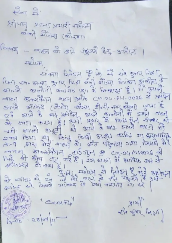 प्रार्थी रवि मिश्रा सिविल लाईन निवासी ने थाना बांकीमोंगरा में शिकायत ज्ञापन देते हुए बताया कि प्रतिदिन कि तरह वें अपने काम से वापस आकर अपनी वाहन क्रमांक CG- PH – 0026 TIGUN कार को अपने क्वार्टर नंबर 18/1 के सामने खड़ी कर अंदर चला गया । सुबह जब अपनी गाड़ी को देखा तो पीछे का शीशा टुटा हुआ था , प्रार्थी रवि मिश्रा के द्वारा दिये गये जानकारी के अनुसार गाड़ी का शीशा टुटा देख मेरे द्वारा आसपास के कुछ सीसीटीवी कैमरे को चेक किया गया । जिसमें रात लगभग 1:50 बजे एक अज्ञात व्यक्ति मेरे घर तरफ़ से मुख्य चौंक तरफ आते दिखाई दे रहा है , और कुछ अज्ञात लड़के मेरे मोहल्ले में काफी देर तक मौजूद थे । जिस पर मुझे संदेह है कि उनके द्वारा मेरे कार का शीशा तोड़ा गया है । फिलहाल वाहन मालिक रवि मिश्रा ने इसकी शिकायत थाना बांकीमोंगरा किया है , अब देखना होगा कि क्या घटना को अंजाम देने वाले आरोप पुलिस की गिरफ्त अबतक आते हैं । या यू कहे असामाजिक तत्वों का हौंसले बुलंद बढ़ते जायेगा ।