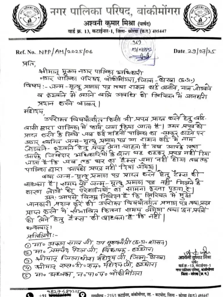 पालिका मुख्य अधिकारी का ध्यानाकर्षण कराते हुए अश्वनी मिश्रा ने लिखा कि प्रमाण पत्र, राशन कार्ड व अन्य जरूरी प्रपत्र समय से नहीं मिलने पर लोगों को बड़ी परेशानियों का सामना करना पड़ता है ।