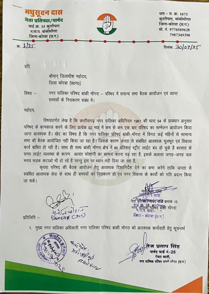 छत्तीसगढ़/कोरबा बांकीमोंगरा नगर पालिका परिषद में नगर पालिका के नेता प्रतिपक्ष मधुसूदन दास के नेतृत्व में एवं ज़िलाध्यक्ष मनोज चौहान के विशेष उपस्थिति में सामान्य सभा के आयोजन एव पूरे पालिका क्षेत्र में व्याप्त समस्याओं के निराकरण की मांग को लेकर समस्त विपक्षी पार्षदों के साथ जिलाधीश से भेंट किए एवं जल्द से जल्द सामान्य सभा का आयोजन एव बंद स्ट्रीट लाइट,जगह जगह जल भराव,सड़क कटाओं की समस्याओं के निराकरण की मांग को लेकर पत्र सौंपा एवं जल्द से जल्द निराकरण की मांग की गई ।