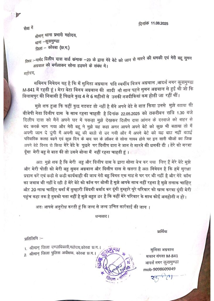 अब पार्षद व पीआईसी सदस्य नगर पालिका परिषद बांकीमोंगरा दिलीप दास पर एक और मामला सामने आया है । जिसमें प्रार्थी आदर्श नगर कुसमुण्डा निवासी सुनिता अग्रवाल ने गंभीर आरोप लगाते हुए कुसमुंडा थाना में लिखित शिकायत दी है कि दिलीप दास ने उनके बेटे विनय अग्रवाल को जान से मारने की धमकी दी है और उनकी बहू सुमन अग्रवाल के साथ मिलकर घर से सोना गायब किया है ।