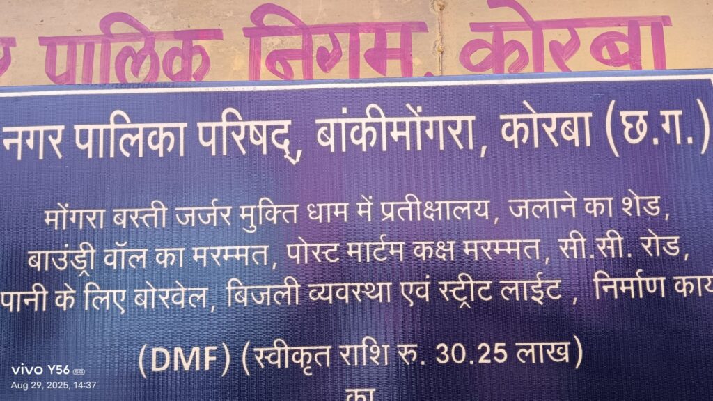 1- जिसमें वार्ड क्रमांक 03 मोंगरा बस्ती में स्थित मुक्तिधाम में प्रतीक्षालय , शव जलाने का शेड , बाउंड्री वॉल का मरम्मत , पोस्टमार्टम कक्ष मरम्मत , सी.सी. रोड़ , पानी के लिए बोरवेल , बिजली व्यवस्था व स्ट्रीट लाइट निर्माण कार्य के लिए DMF फंड से स्वीकृत राशि 30.25 लाख।