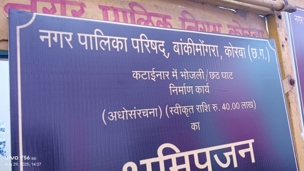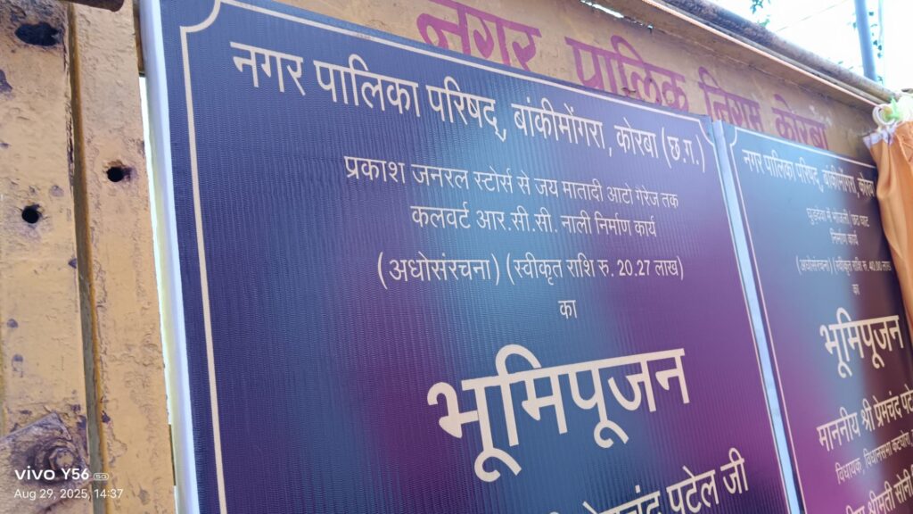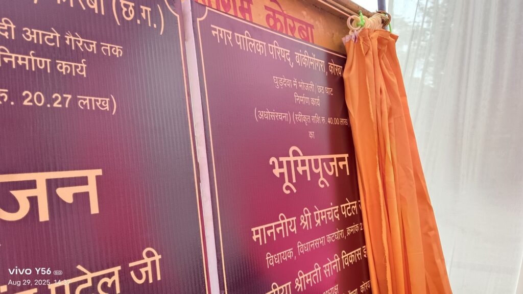 छत्तीसगढ़/कोरबा शुक्रवार को जिले के नगर पालिका परिषद बांकीमोंगरा में मुख्य अतिथि कटघोरा विधायक प्रेमचंद पटेल , कार्यक्रम की अध्यक्षता पालिका अध्यक्ष श्रीमती सोनी विकास झा व अन्य जनप्रतिनिधियों के उपस्थिति में लगभग 1 करोड़ 30 लाख का विभिन्न वार्डों में विभिन्न विकास कार्यों का भूमिपूजन हुआ।