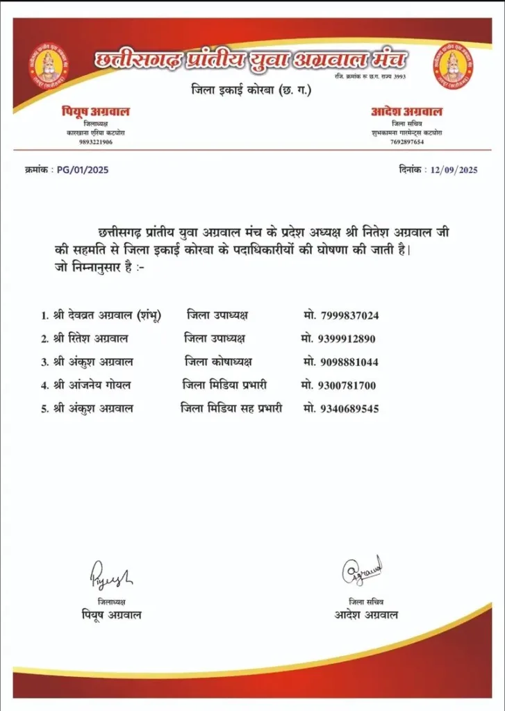 रितेश अग्रवाल बने छ:ग प्रांतीय युवा अग्रवाल मंच का कोरबा जिला उपाध्यक्ष।