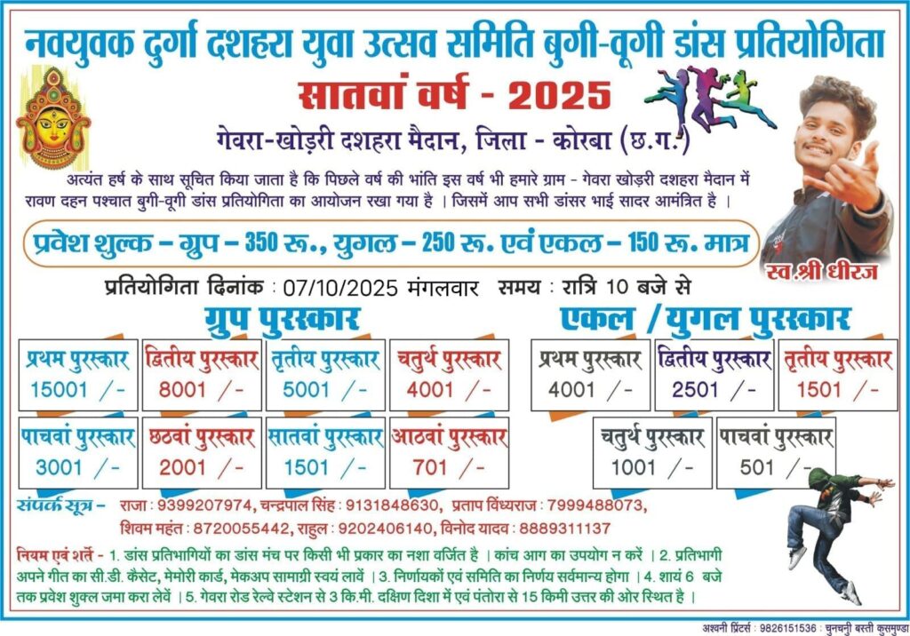 रुपेश महंत जिला ब्यूरो कोरबा कुसमुंडा ( गेवरा बस्ती ):खोडरी में 7अक्टूबर को होगा रावण दहन ( दशहरा ) एवं डांस प्रतियोगिता।