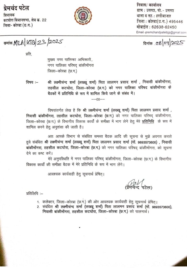 छत्तीसगढ़/कोरबा नगर पालिका परिषद बांकीमोंगरा के बैठकों व विभागीय कार्यों की समीक्षा बैठक में प्रतिनिधि के रुप में शामिल होने के लिए कटघोरा विधायक प्रेमचंद पटेल ने लक्ष्मीचंद शर्मा ( लख्खू शर्मा ) को विधायक प्रतिनिधि नियुक्त किया है । देखें नियुक्ति पत्र ।